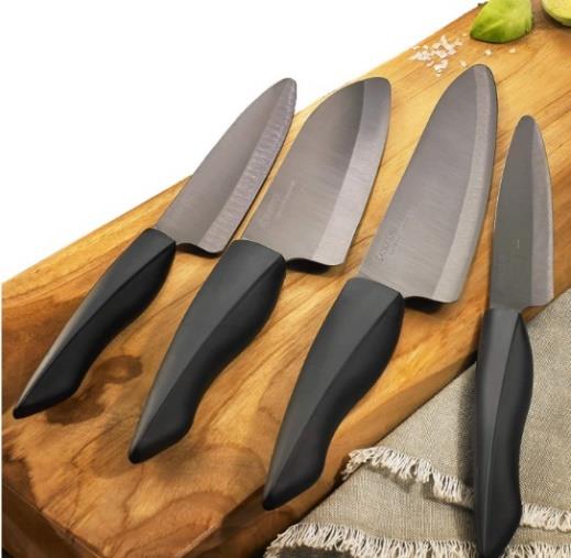 newly developed blade. It was repeatedly pressed onto a stack of paper to see how many sheets of paper are cut after ongoing use. INNOVATIONblack maintained its sharpness throughout, degrading minimally, which is an excellent result after the 128th cutting cycle, and doubling the edge retention of KYOCERA’s traditional ceramic knives. Kyocera's globally patented (US #10,118,302 B2) Z212 INNOVATIONblack series features a dark graphite grey blade and black handle. Made in Japan with exceptional quality and beauty, the series includes seven sizes ranging from approximately $39.95 - $89.95 including a Paring, Utility, Slicing, Santoku, 6-inch and 7-inch Chef's knives and a 2PC Knife Set packaged in a Kyocera embossed gift box. Bryan Katz was one of the first customers to use INNOVATIONblack: "These knives aren't sharp. They don't cut. They simply part the food. There's absolutely no kerf, no tearing, and no bruising. These blades are virtually non-existent thin. Razor-blade thin. And then sharpened even thinner. This, of course, makes them weightless too. I quickly found that I could simply push them through the peppers, but with a normal comfortable slicing motion, there simply was no pepper. We're not talking soft butter here. We're talking liquid butter. Straight-up air. I couldn't feel the pepper at all. I felt my arm moving, and then I felt a cutting board." Kyocera was one of the first companies in the world to begin manufacturing and selling kitchen knives with blades made from fine ceramics. Since 1984, Kyocera has been continually enhancing the material technology and design of its ceramic knives, developing its product range with various colors and styles and converting customers worldwide to fans of ceramic kitchen tools. Kyocera's traditional ultra-sharp zirconia ceramic blade will maintain its sharpness up to 10x longer than metal knives. Its new patented INNOVATIONblack series boasts twice the long-lasting sharpness of previous blades. Learn more about the craftsmanship behind Kyocera's Japan-made ceramic knives here.